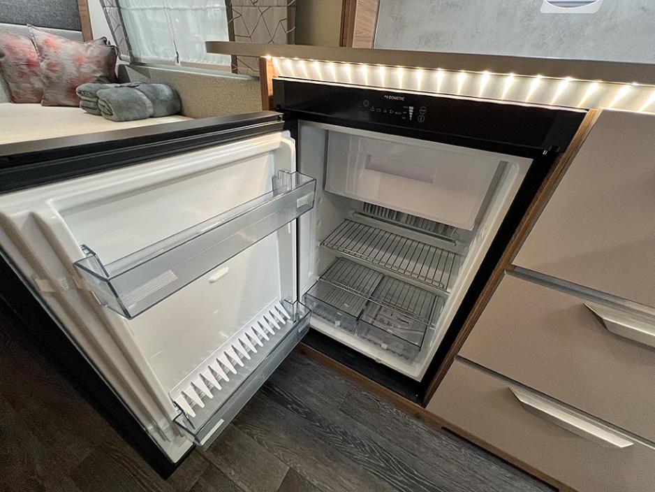 Et Dometic 10-serie kjøleskap er på plass, luksus. En ledlyslist er montert i underkant av kjøkkenbenken. Sammen med en metall-list gir denne et behagelig og kult indirekte lys. Samme type list er plassert mellom skuffene. En fin designdetalj som hever helthetsinntrykket.
