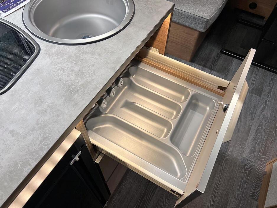 Det er noe arbeidsplass på kjøkkenbenken, til tross for en stor koketopp med tre bluss. Det midterste kokeblusset er stort og har god plass til en stor kjele. Kanskje ikke et naturlig valg om man ser på modellen som en reisevogn for to, men for en familie er det supert!