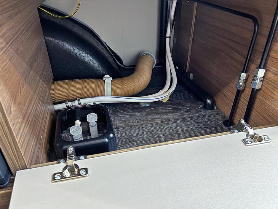 Det er noen vannrør her, som vi helst hadde sett var bedre beskyttet. Under venstre seng er det plass til batteri.