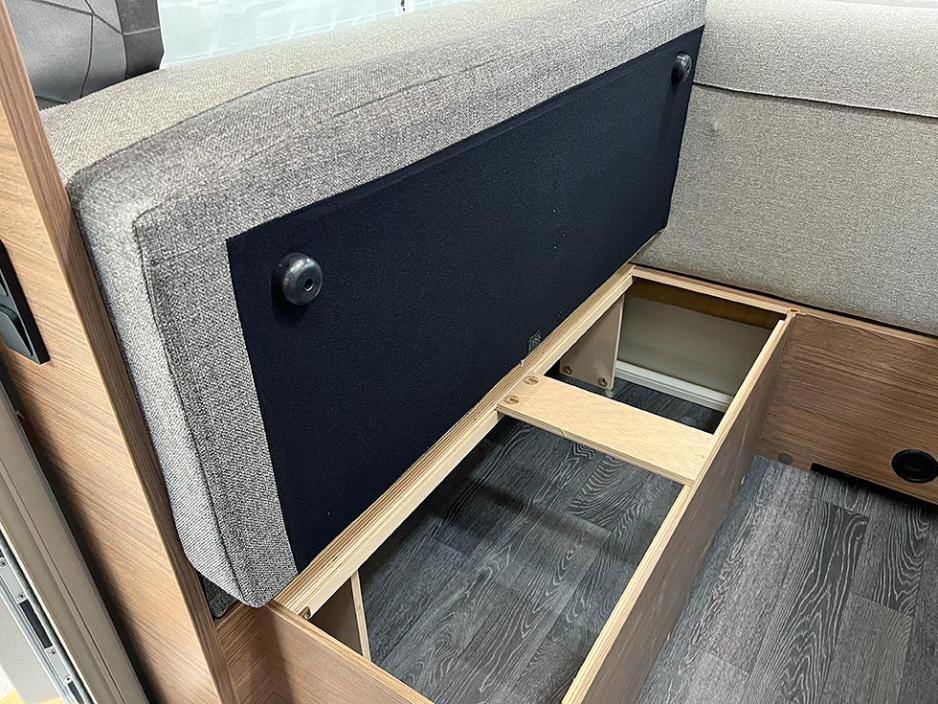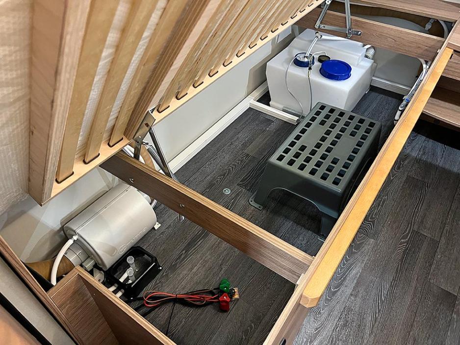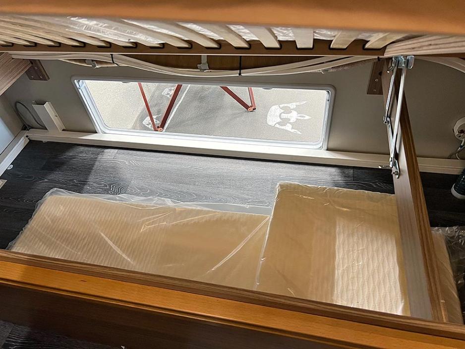 Under høyre seng er det lagringsplass, man vipper opp sengebunnen. Den lar seg ikke åpne helt på grunn av kjøkkenbenken. Men, ikke minst på grunn av den utvendige luken, er det totalt sett grei tilgang til lagringsplassen her, og ingen problemer med å få plass til stoler og bord.