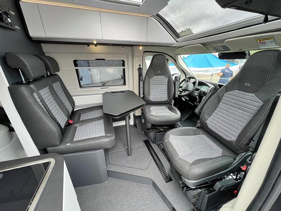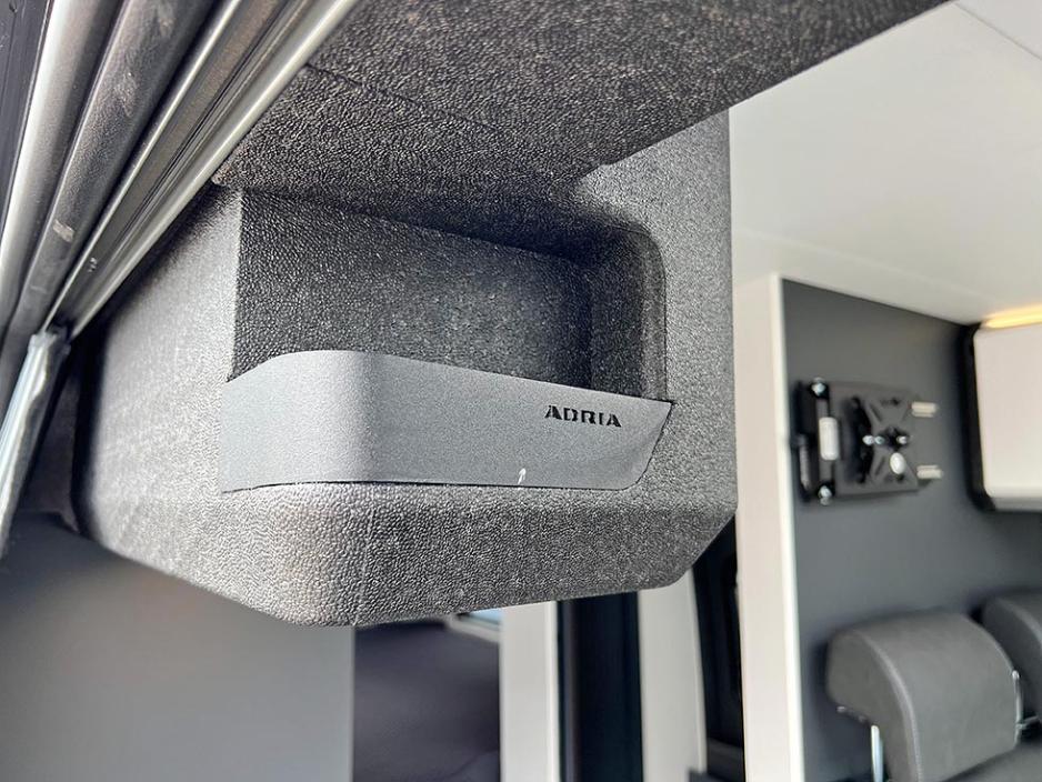 En annen nyhet er at Adria har laget plass til å stuve vekk bordet i dobbeltgulvet ved føttene til baksetepassasjerene. Det betyr at man kan optimalisere sikkerheten på tur ved å fjerne bordet før avreise. Som et lite kjekt plaster på såret for baksetepassasjerene, er det mulig å bruke en liten minihylle for å lagre småting og til koppholder.