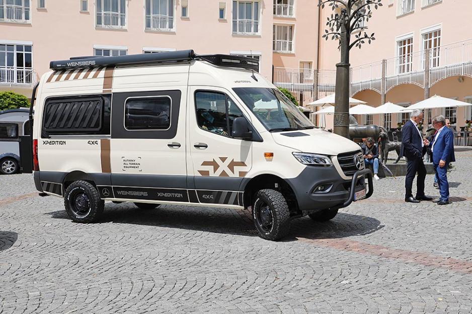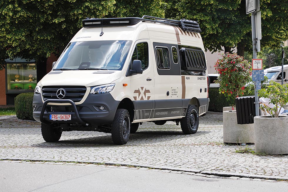 X-pedition er bygget på Mercedes Sprinter, og selv om Weinsberg forteller at den kan leveres med bakhjulsdrift er dette en bobil som ingen vil kjøpe uten 4x4. Da ruver den ekstra høyt over bakken (100 mm høyere fjæring), og kommer rigget på massive 245/75 R 16 terrengdekk. Dekoren er tøff, og sandfargen er neppe tilfeldig. Mye utstyr er allerede utviklet: Takstativ, stige, kufanger og en utvendig lagringsboks i metall på bakveggen. At alt er i moteriktig svart, er ikke så overraskende.