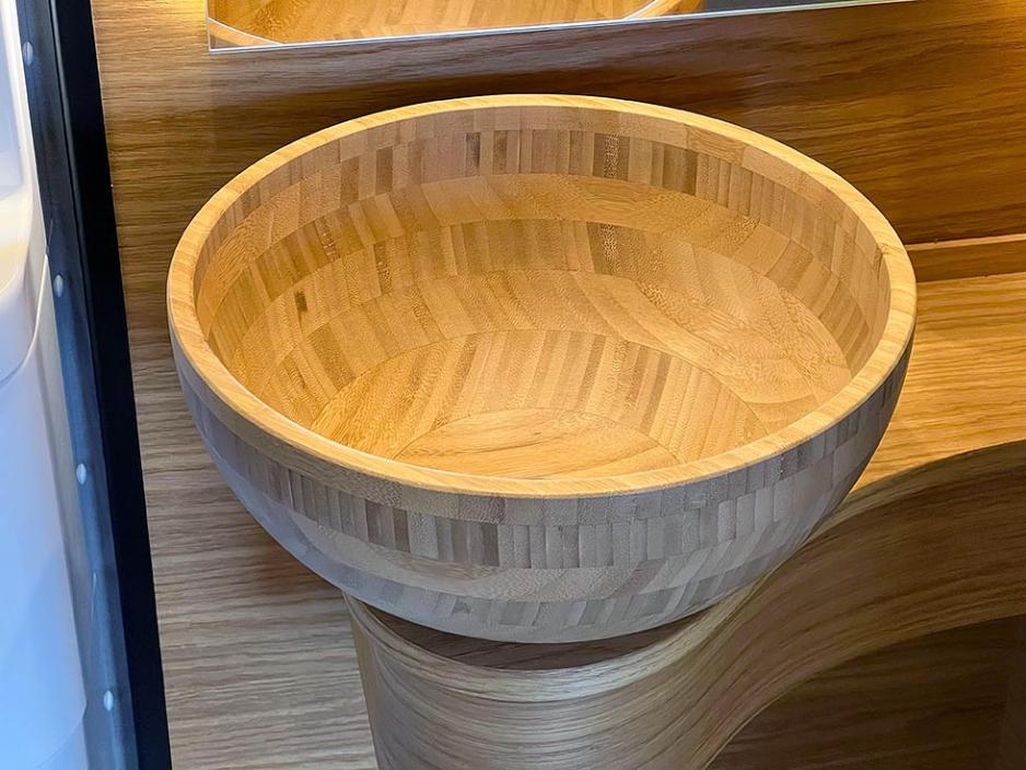 Fornybare råmaterialer brukes også i bordet og kjøkkenbenken. Her benyttes en kjerne av såkalte popcornpaneler, utviklet fra mais kledd i oljet eikefiner. Panelene har samme mekaniske egenskaper som kryssfiner, men bare halvparten av vekten.