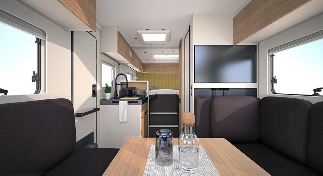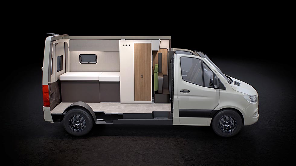 Er også en bybobil, men basert på Mercedes Sprinter. Den seks meter lange modellen har langsgående enkeltsenger. Det er mulig takket være en ny og patentert løsning: et skyvbart baderom. På dagtid har man en firepersoners sittegruppe fra førersetet og langt inn i venstre seng. På natten skyves sittebenk og bord sammen, og en ekstra del legges ned på sengen. Dette er nettopp den typen unike løsninger Brandl ønsker. Fire dekoralternativer for dører og luker, samt et bredt utvalg farger og tekstiler gir nesten 100 kombinasjonsmuligheter. Prisene vil bli markedets gunstigste, og modellen kan leveres med bakhjulsdrift eller firehjulsdrift.