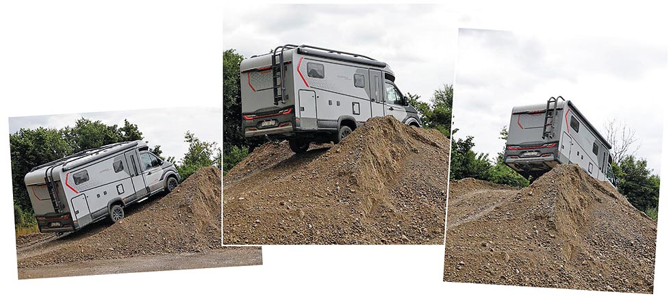 Og krabbet over, det gjorde Globebus Performance 4x4. I tillegg kjørte den over en humpete vei med hjulløft for annenhver meter. Det ser imponerende ut, selv om alle bakker og vinkler i den spesialbygde hinderløypa nok var tilpasset nøyaktig hva bobilen kan klare.