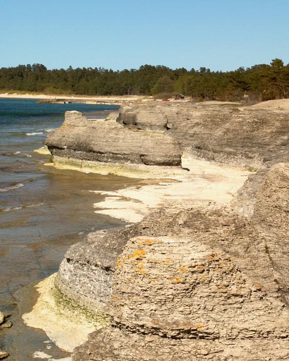 Lengre mot nord parkerer vi bobilen på en liten parkering for å gå en svipp ned på stranden. På denne kyststrekningen fornemmer man veldig tydelig det kalkstenslag (Alvaret) som danner det meste av Øland. Inne på øya kan det være vanskelig å se, da det er dekket av et tynt lang beplanting. Her på stranden kan man se hvordan steinene ligger lag på lag. Et vakkert stykke natur. Har du med barn er det et godt sted å lete etter fossiler.