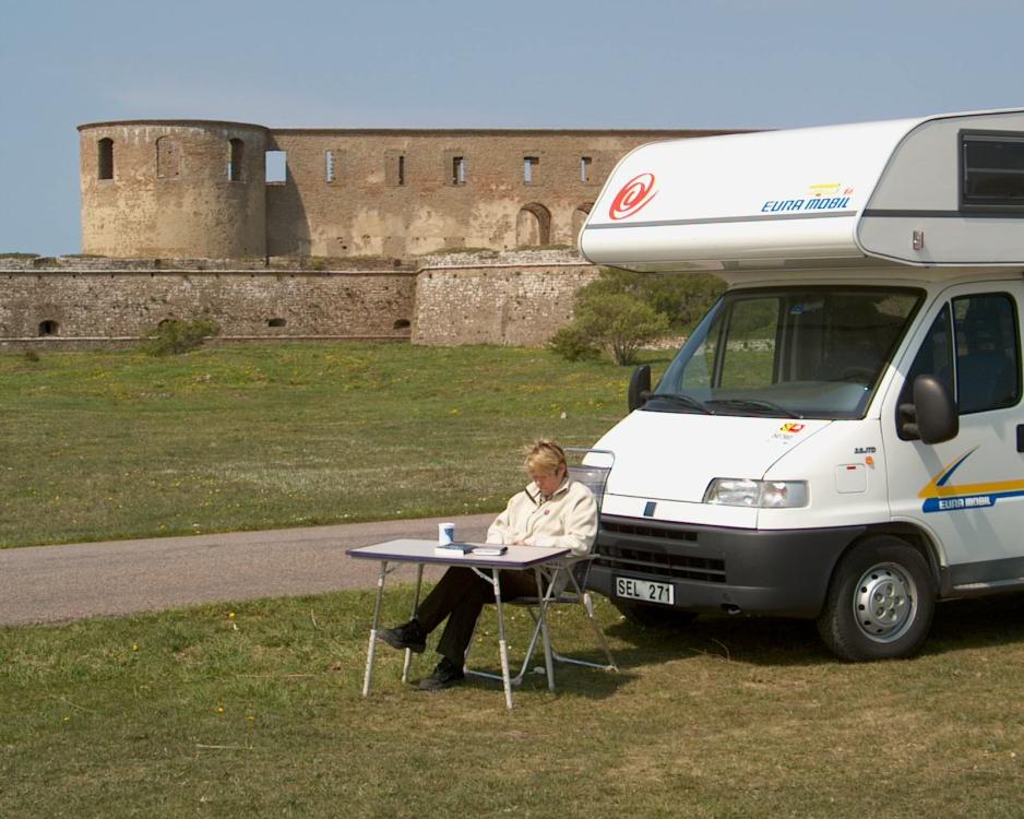 Det er i ferd med å bli sent på kvelden, men lyset er utrolig fint. Vi fornemmer helt klart at det er blitt vår. Vi har kjørt i strålende vær hele dagen fra Danmark. På forhånd har vi booket plass til bobilen på Sonjas Camping ved Löttorp, som ligger på den nordlige delen av øya. Her skal vi være i første del av ferien. Det virker som plassjefen er på jobb døgnet rundt. Det er utenom sesongen, så Sonja har sagt at hun nok ikke vil være der, men at vi bare kunne kjøre inn å finne en plass, som passer oss.