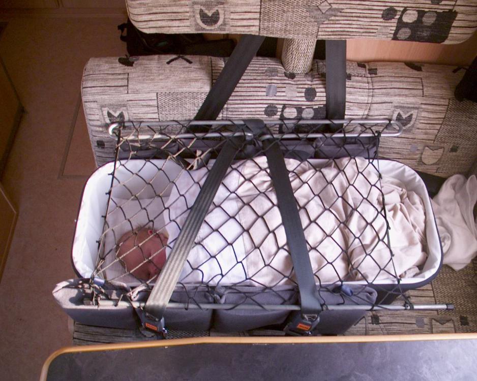 Når vi kjører står bærebagen med Mathias på setet ved spisebordet, der det også er sikkerhetsseler. Der står han trygt og godt. Sover det meste av tiden, og er vel egentlig likeglad med å være på Øland og på camping, men vi synes selvfølgelig, at det er deilig å ha han med.