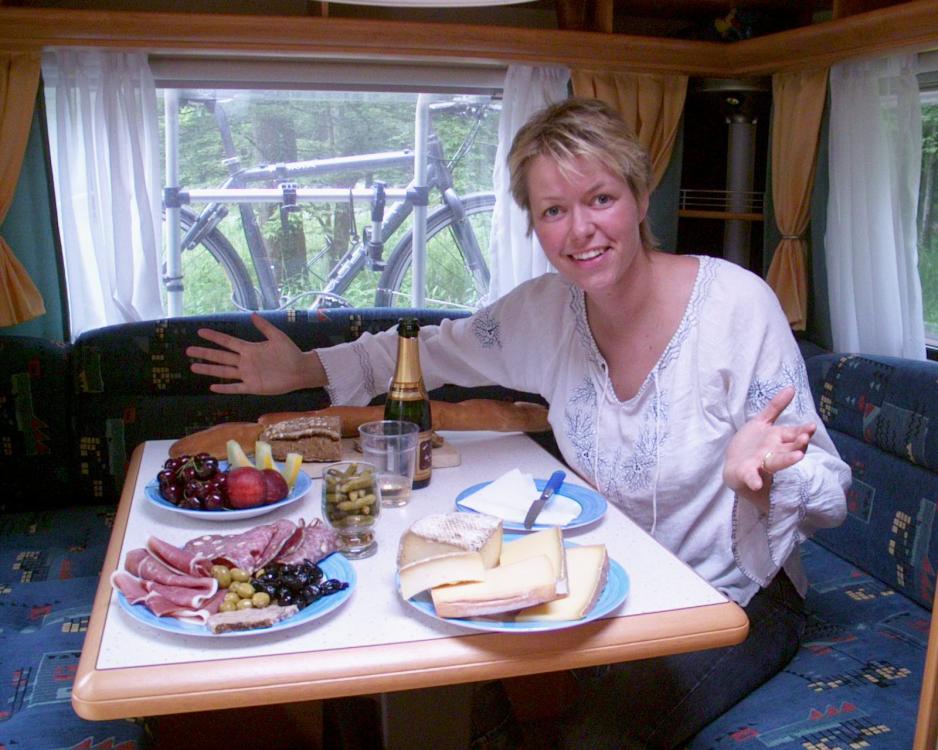 Vi har handlet inn til den helt store lunsjen. Vi er jo tross alt i Frankrike og der er det så mange deilige spesialiteter. Vi disker opp i campingvognen og arrangerer et praktfullt og velsmakende lunsjbord bestående av 3 forskjellige slags oster fra området, lufttørket landskinke med melon, oliven og to sorter pølse, friske kirsebær, ferskener og selvfølgelig baguetter, som er fast ingrediens på franskmennenes bord uansett tid på dagen. Det hele skylles ned med et glass champagne, fra det stedet vi besøkte i går. Vi blir der i 1½ time. Det deilige er, at det ikke er noe man bare spiser. Man sitter liksom bare og gumler til man er mett. Og det krever tid, men tid har vi. Da vi er klar til avgang må jeg rygge campingvognen ut på veien igjen. Det går over all forventning. Godt jeg har trent hjemme på parkeringsplasser og småveier. Jeg får helt sikkert mer bruk for det i fjellene.