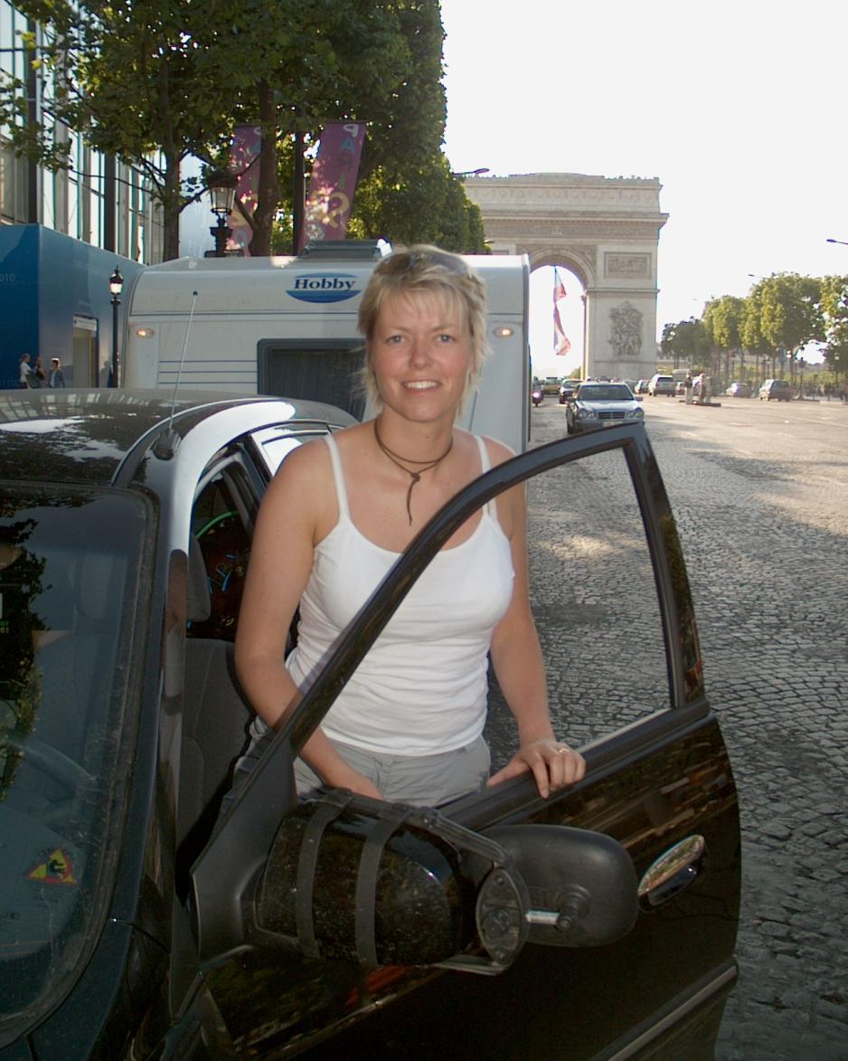 Varmen og bråket er slående i den pulserende storbyen, mens vi kjemper oss vei på dagens etappe. Det er ikke lett med en campingvogn. Den hører ganske enkelt ikke hjemme i Paris, men jeg insisterer. Nå har jeg heldigvis bodd i Frankrike og kjenner franskmennenes temperament. De båser seg opp og kjefter vilt med mye armer og bein. Mitt mottrekk er et stort smil og en skuldertrekning, og det hjelper. De rister på hodet, men smiler tilbake. Det er nok bra et det er meg som sitter bak rattet og ikke Rasmus. Med mye bry og problemer får jeg kjempet oss inn på Champs Elysées, der vi kjører inn til siden og parkerer. Jeg vil ha et bilde og får det. Slik.