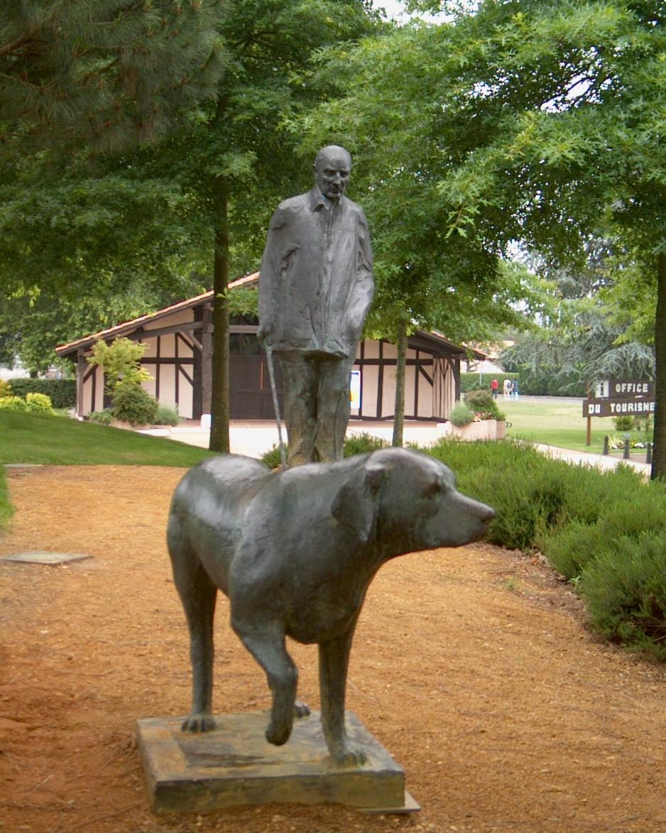 På vei ut av byen videre på vår vei kjører vi gjennom en annen liten by med navn Soustons, der vi passerer en minnepark for François Mitterand, som var fransk president fra 1981-1995. Han døde i 1996, 80 år gammel og har bodd i byen i 31 år. I parken er han minnet på den måten folk så ham oftest. Gående med sin hund.