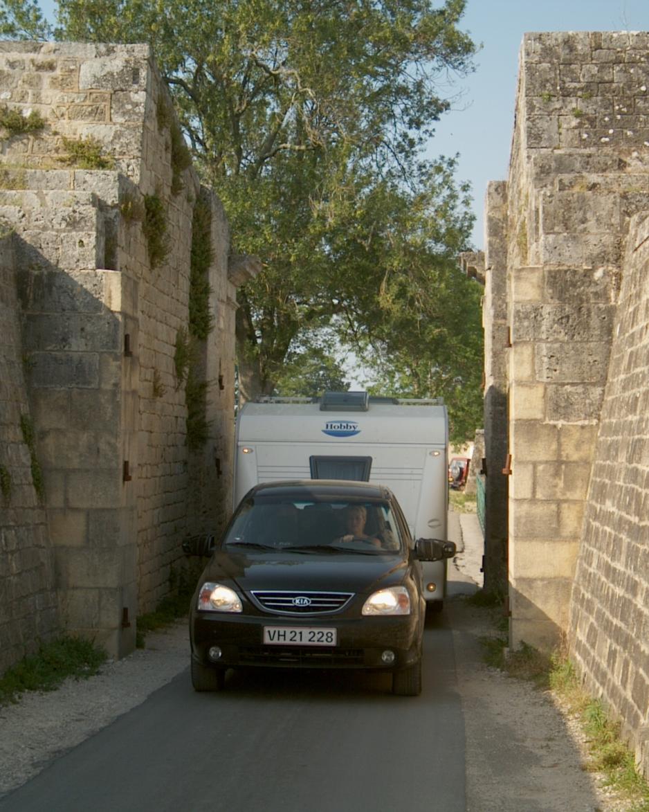 Det er litt vanskelig å finne inngangen til selve plassen, og det er veldig liten plass, men det går og da vi først er kommet inn og på plass, viser det seg å være en av de hyggeligste plasser vi har bodd på. Oppstillingsplassene er godt fordelt i hele borganlegget og vi ligger helt for oss selv. Fasilitetsbygningene er inne i selve borgen. Morsomt og annerledes. En forholdsvis kort dag, selv om vi har kjørt ganske langt, men hele etappen har vært flat som en pannekake. Sikkert noe Tour de France rytterne heller ikke har noe i mot etter alt det de har vært igjennom. Vi sees i morgen.