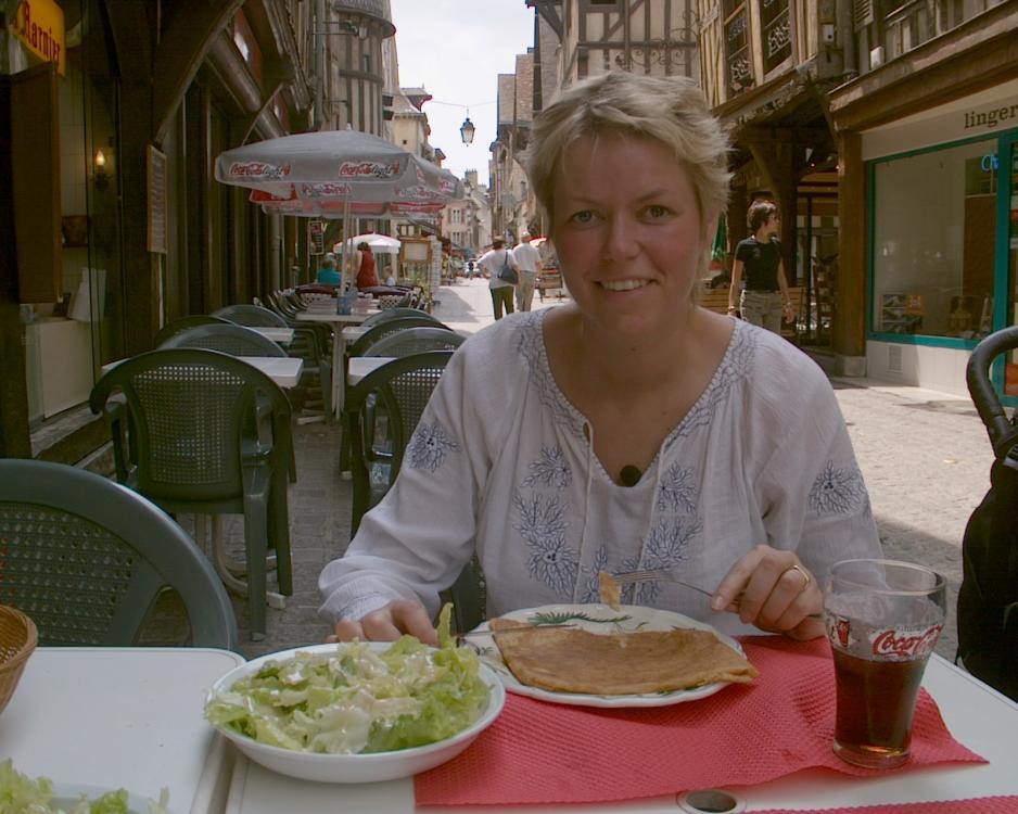 Hele den gamle bydelen er fyllt med små spesialforretninger med brukskunst og delikatesser. Fortauskaféene ligger på rekke og rad, og vi finner et mindre crêperi, der dagens lunsj inntas. De franske pannekakene fåes i stort sett alle former og fasonger og er en av mine livretter. Vi bestiller 3 forskjellige, så kan vi smake av hverandre. Vi starter med crêpes salée (de som ikke er søte) og yar med 3 crêpes sucré (søte) til dessert. Alt sammen nytes på skyggesiden av gaten, for det er ca. 30 varmegrader.