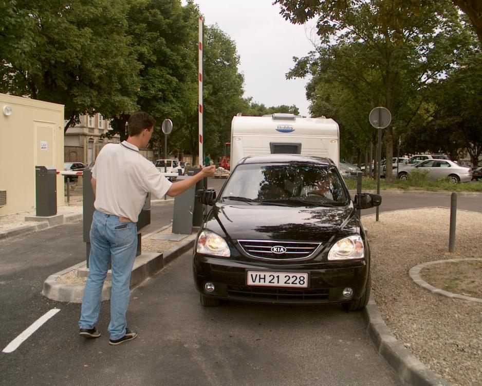 Tilbake på parkeringsplassen finner vi først en glohet bil. Det er godt vi har aircondition. Vi er på forhånd helt kokt i varmen, men det blir værre, for da jeg skal ut fra parkeringsplassen, er det enda mindre plass på utkjøringen enn innkjøringen. Med mye møye og besvær og mer lykke enn forstand fikk jeg bil og campingvogn under bommen og ut gjennom den skarpe svingen uten skrammer. Godt at parkeringsvakten hjalp til og selv hadde gått med på å slippe meg inn. Jeg håper gartneren har kommet seg over de brukne blomstene. La oss komme ut av byen med dette vogntoget.