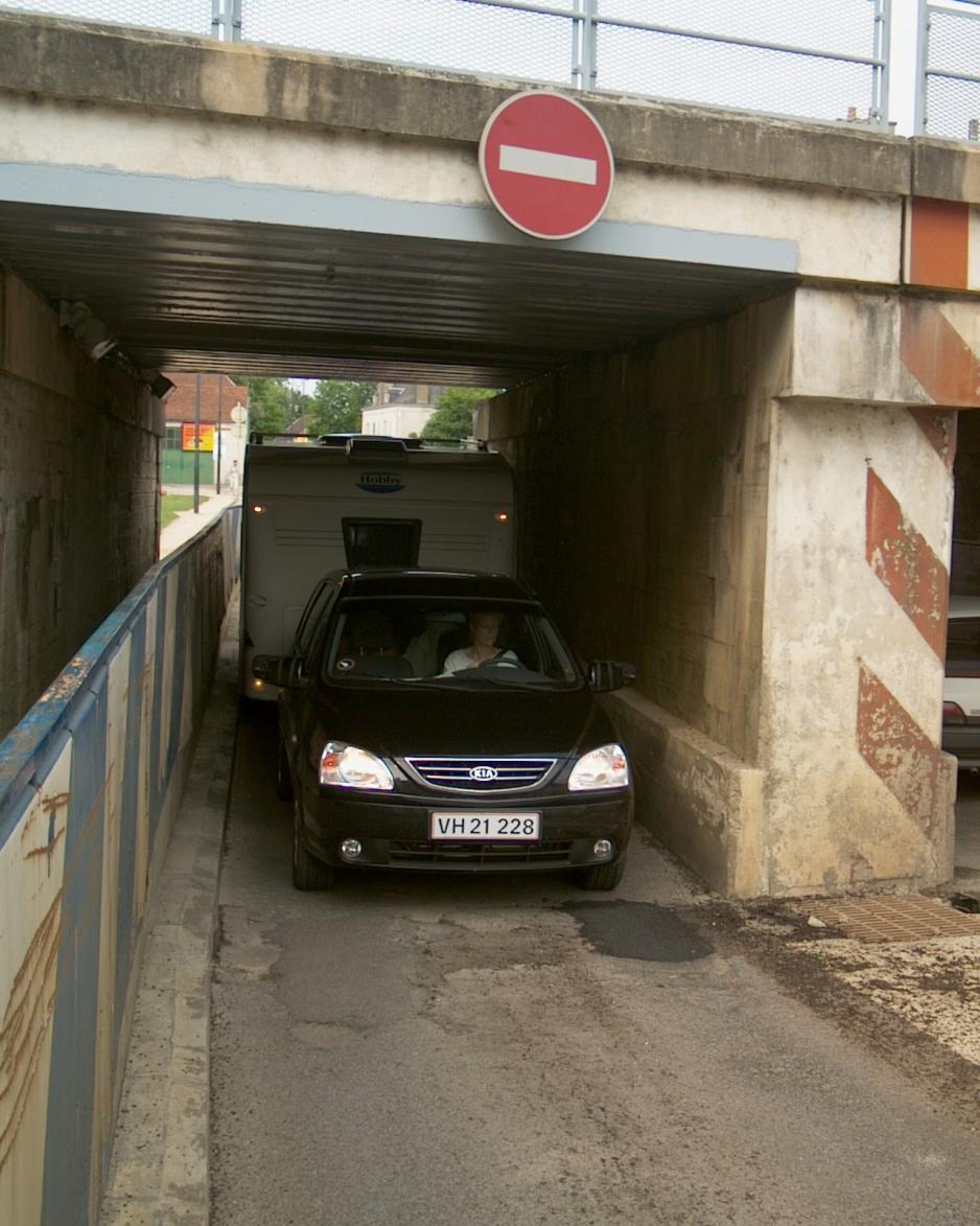 Nede midt i byen skal vi under en bro, og på skiltet kan jeg se, at den er 2,40 bred. Campingvognen er 2,30 meter bred. Tungen rett i munnen og første gear. Det går akkurat. Det kan ofte være et problem i de franske byene. Plutselig befinner man seg i en smal gate eller i en sving, der man ikke kan få campingvognen med rundt. Hittil har det gått, men det har vært nære på, at vi har laget fullstendig kaos med ekvipasjen.