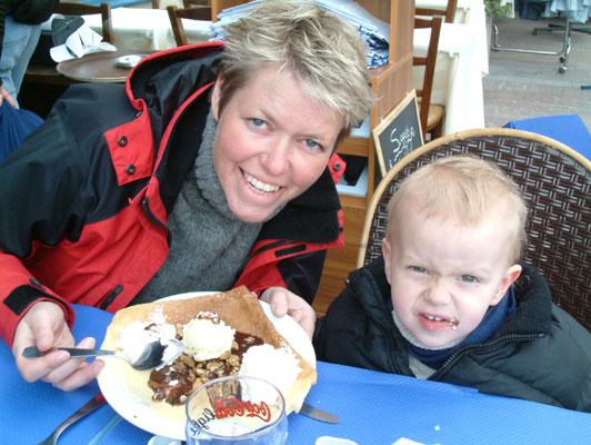 Noe av det første vi gjør, når vi kommer til Frankrike er å gå på crêperi (tynne pannekaker). Det finnes to slags pannekaker: salé (salte) og sucré (med sukker). Dersom du ikke er så sulten så gå rett på de søte, slik at du ikke risikerer, at det ikke er plass. De saltede fås med skinke, ost, egg med mer. De søte fås med sjokolade, is, fløteskum, sukker osv. Og ofte pyntes de med litt Grand Marnier eller aller helst Calvados, som er en spesialitet i Normandie.