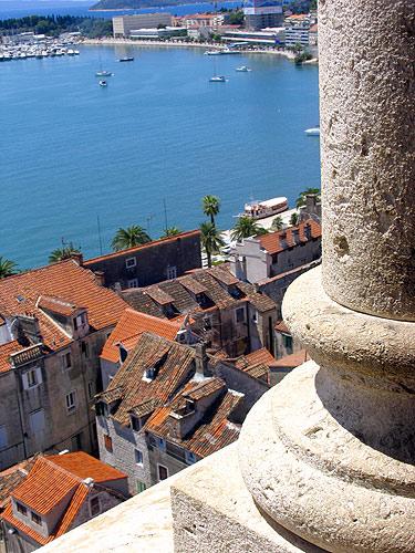 Fra campingplassen i Omis kan man ta bussen til Split. Den går én gang i timen. Fra stasjonen i Split er det bare et kort stykke å gå ned til den praktfulle havnepromenaden. Den er kunstig anlagt og ligger rett foran det store romerske palasset: Diokletians palass, som hadde sin front helt ned til vannet her. I dag kan man finne hvile på mange benker under høye daddelpalmer og skue opp mot palassets murer. Jo, de er her faktisk enda. Selv om det er nesten 2000 år siden, at palasset ble bygd. Det særpregede oppstår ved, at innbyggerne i tidens løp har bygd hus på de gamle, ærverdige murene. Enten oppå eller i murens/palassets nederste etasjer. Her synker temperaturen betraktelig og det har gitt mulighet til, at et utall av boder slår seg ned her med de sedvanlige tilbudene til turistene – fra t-skjorter til smykker. Den firkantede plassen, det gamle romerske forum, vitner også om middelalderens forskjellige byggestiler. Her ses alt fra veneziansk stil til barokk. Splits indre bydel er oppført på UNESCOs verdenskulturarvsliste og alle de smale smugene innbyr til et veldig interessant tidsstudium.