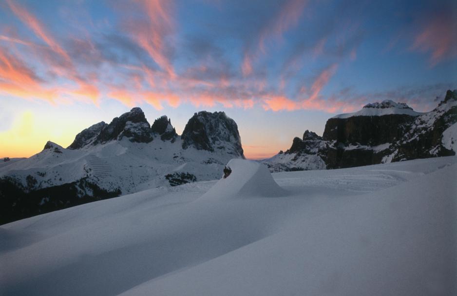 Mottoet i Dolomittenes flotte by er at man ikke kan ha stått på ski i Canazei uten å ha kjørt de ca. 40 km inkl. lift, som er hele veien rundt det fascinerende Stella-massiv. Det spiller ingen rolle om du kjører med eller mot klokken, men start tidlig om morgenen, så du får tid til å nyte de landskap du passerer, og ikke minst besøke de små hytter, som ligger i terrenget. Vi tar hele turen rundt på Telemark, noe som i seg selv er litt av en kraftanstrengelse. Telemark er ikke noe italienerne ser særlig ofte, så vi fikk mange optimistiske tilrop i løpet av dagen. Italienerne er selv mer opptatt av slalåm og pastellfargede heldrakter. De står helst ikke på ski hvis det er dårlig vær, og med dårlig vær mener de lett skyet eller lite grann vind. Blå, blå himmel er det som må til før italienerne synes det er ordentlig vær for skiturer.
