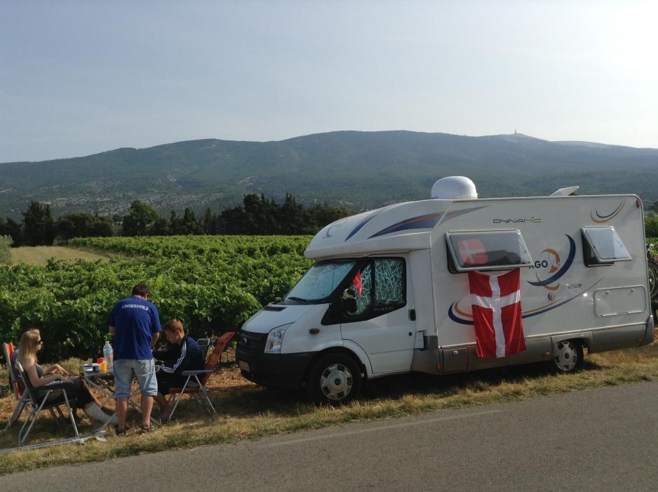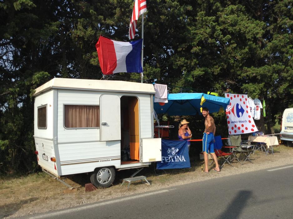 Kreativiteten er stor blant veldig iherdige fans/tilskuere, som vil veldig tett innpå. En bobil er ren luksus, fordi du kan stanse på siden av veien, når plassen tillater det og så har du alt for hånden. Mange overnatter også i bilene sine eller slår opp et lite telt, der hvor plassen gjør det mulig. Campingvogner kan ikke anbefales med mindre det er veldig god plass. I fjellene kan det bare anbefales å ta med svært små campingvogner. Husk å spørre, hvis du stanser foran et hus eller nær en hage. Det er også viktig å respektere jorder og annen beplantning. Det er ikke allemannsrett i Frankrike.