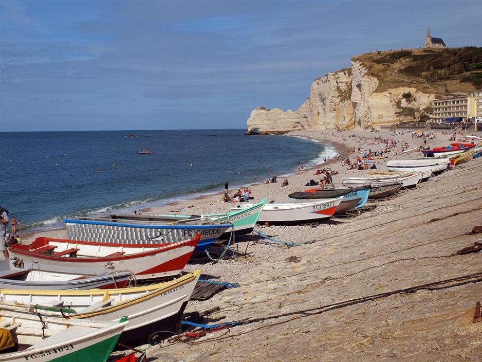 Det er en av de helt store trekkplastre for naturens skuespill, som finner sted her i den lille kystbyen Etretat. Kritt- og sandstensklippene hever seg bratt opp fra havet, som delvis har brutt dem ned. De harde partiene står igjen som festningsmurer og et enkelt sted står det en port ut mot havet. Det er en av de mest fotograferte stedene i Normandie, ja i hele Frankrike. Man må parkere i byens utkant, for det er ganske enkelt ikke plass nok til alle bilene, som gjerne vil se den spektakulære utsikten. Derfra er det ca. 1000 m å gå til stranden og klippene. Det er en lang og flott promenade, som følger hele bukten, men man kan på den sydlige delen av bukten bestige klippene med den gjennombrutte porten. Nord for bukten går en bratt sti opp over jordene ved de bratte klippene, hvorfra man også har en flott utsikt. Stien er oppmerket, men ikke spesielt jevn. Helt oppe på det høyeste punktet ligger en liten kirke Chapelle Notre-Dame-de-la-Garde, nærmest et lite valfartssted. Det er parkeringsplass bak kirken.