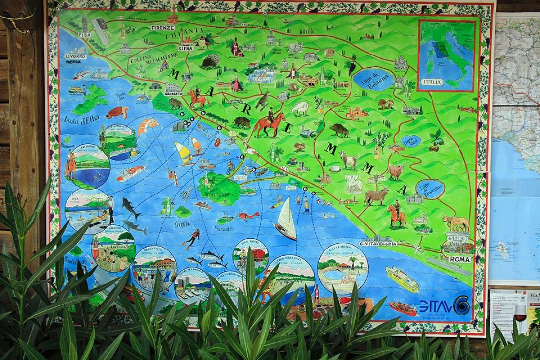 Denne campingplassens største fortrinn er den fine plasseringen, innerst i en bukt. Det er utsikt til havet, Elba og den lille byen Talamone, som henger seg fast på en klippe ved havet. Stemningen er meget rolig og avslappet.