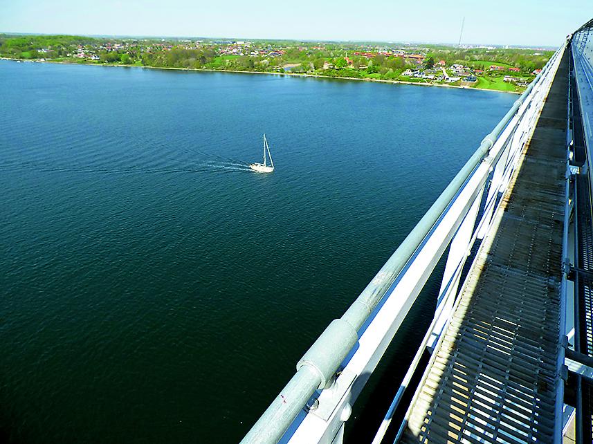 Da vi så smått hadde blitt fortrolige med høyden, ble det klart at vi skulle enda høyere. Noen stigetrinn opp så befant vi oss på tverrbroen 60 meter over vannflaten i sundet. Der hadde vi en formidabel utsikt mot motorveibroen lenger nord, samt ned til det gamle fergeleiet på Fredericiasiden, og vi kunne se helt inn i havnen til Middelfart på Fyn.