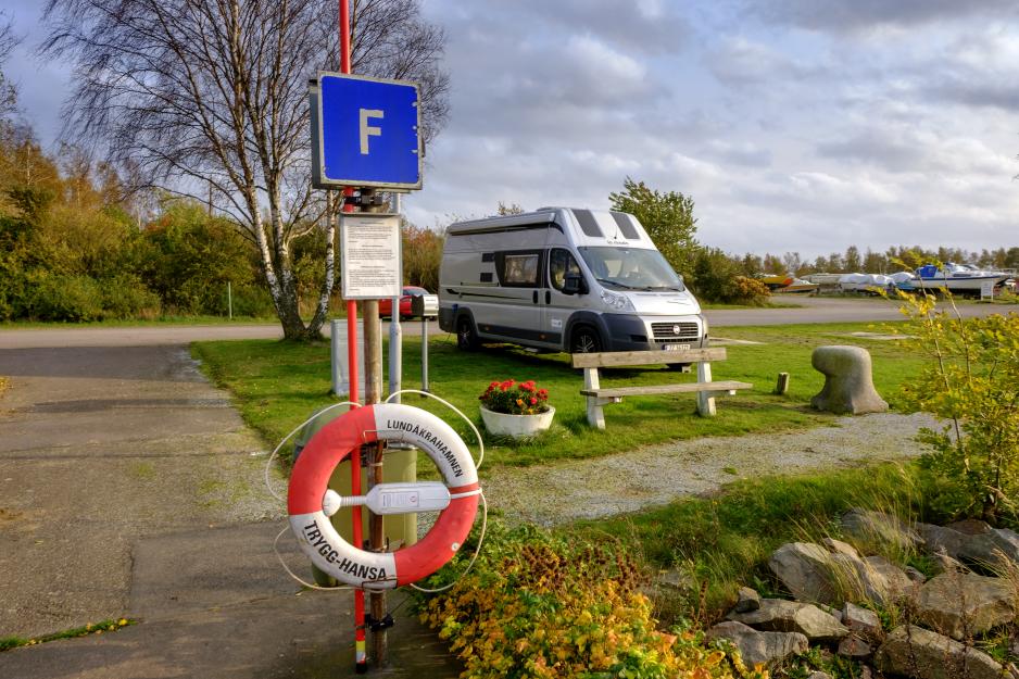 Bobilplass i Lundåkrahamnen i Sverige Småbåthavnen som ønsker bobiler velkommen