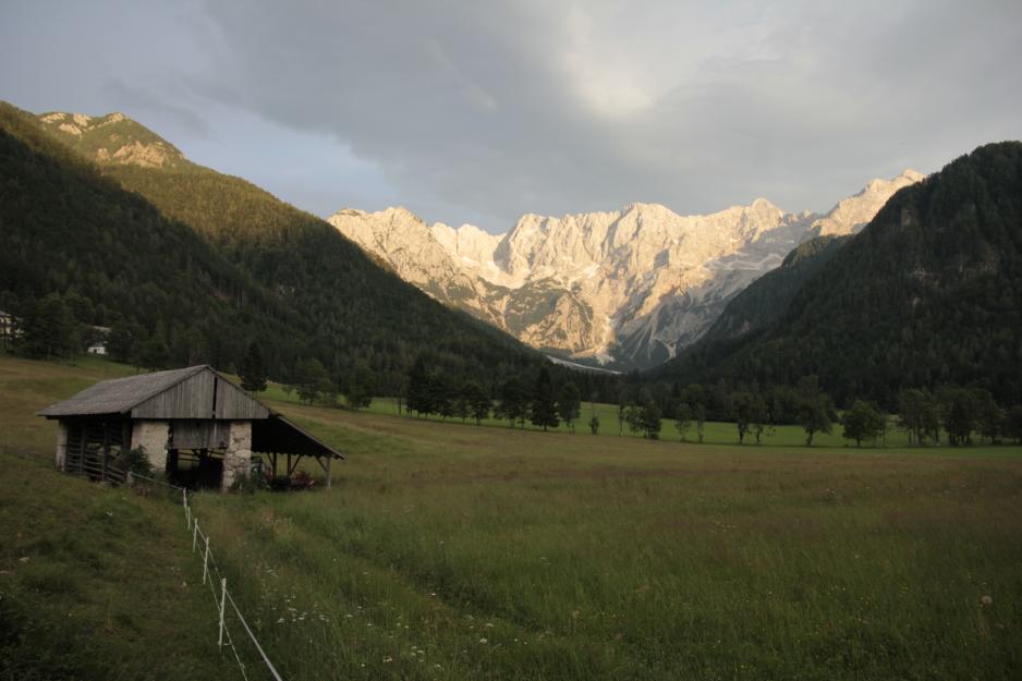Langt mer imponerende omgivelser å skrive hjem om, fant vi hos Senkova Domacija i Zg. Jezersko (N46.4079 E14.5214). Her var det høner og hester i massevis, og et lite serveringssted. I tillegg var det toalett og dusj og benker som kunne brukes av bobilfolket. Området ligger rett ved alpenes østligste isbre, og vi fikk kjenne på den friske og kalde fjelluften - selv i juli. Her kan du gå spektakulære fotturer ved foten eller til toppen av de imponerende fjellene i området. Dette er likevel ikke den eneste aktiviteten som foregår, vi havnet midt i et lokalt sykkelritt - en idrett som er svært populær i området sommerstid. På vinteren er det normalt mulig å stå på ski her, og mange går langrenn. Vi skulle videre nordover til Østerrike og snirklet oss videre på den smale veien som var full av blide sykkelamatører.