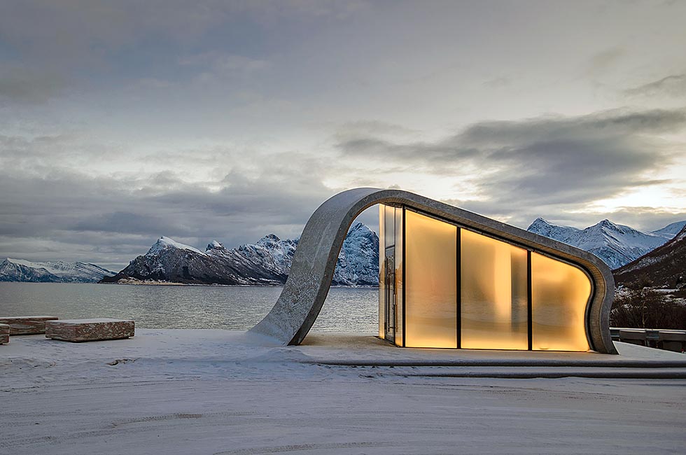 Det er den britiske avisen The Telegraph som har latt seg imponere og sier at dette sannsynligvis er verdens mest idylliske toalett. Den bølgeformede bygningen med utsikt over Norskehavet og de snødekte fjellene i Lofoten har bokstavelig talt bergtatt engelskmennene.