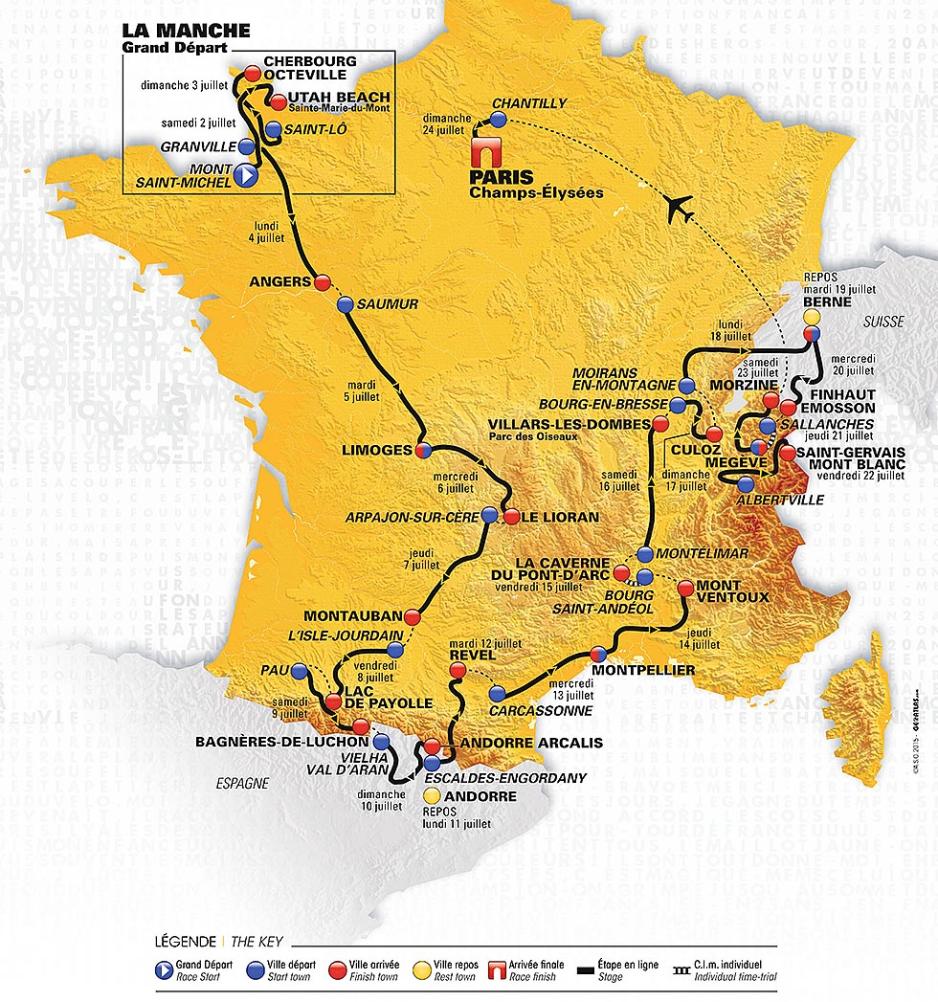 9 flate, 1 bakkeetappe, 9 fjelletapper, 2 individuelle tidsprøveetapper, 2 hviledager.