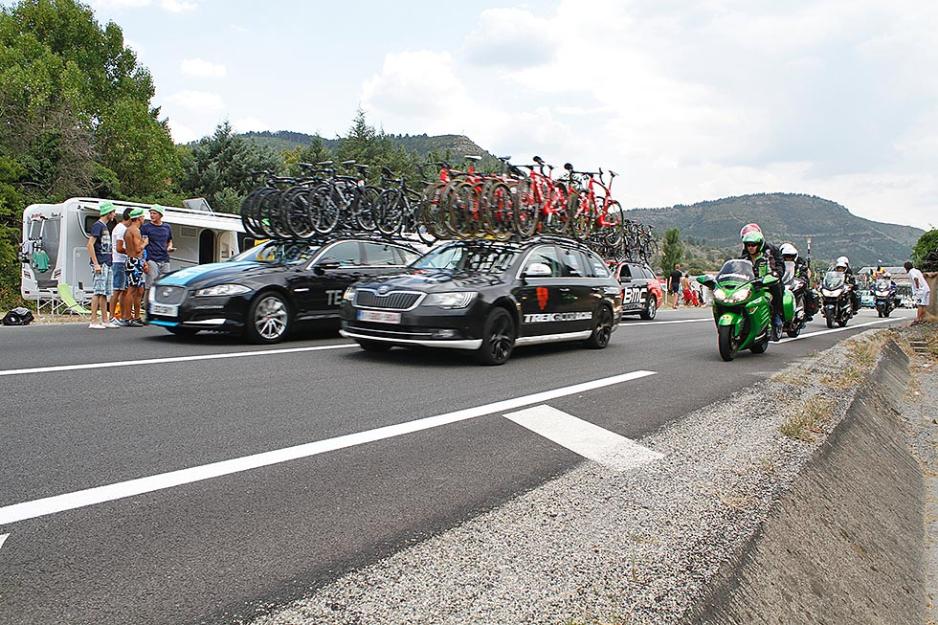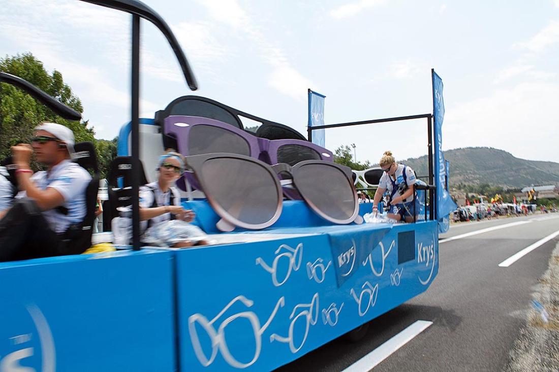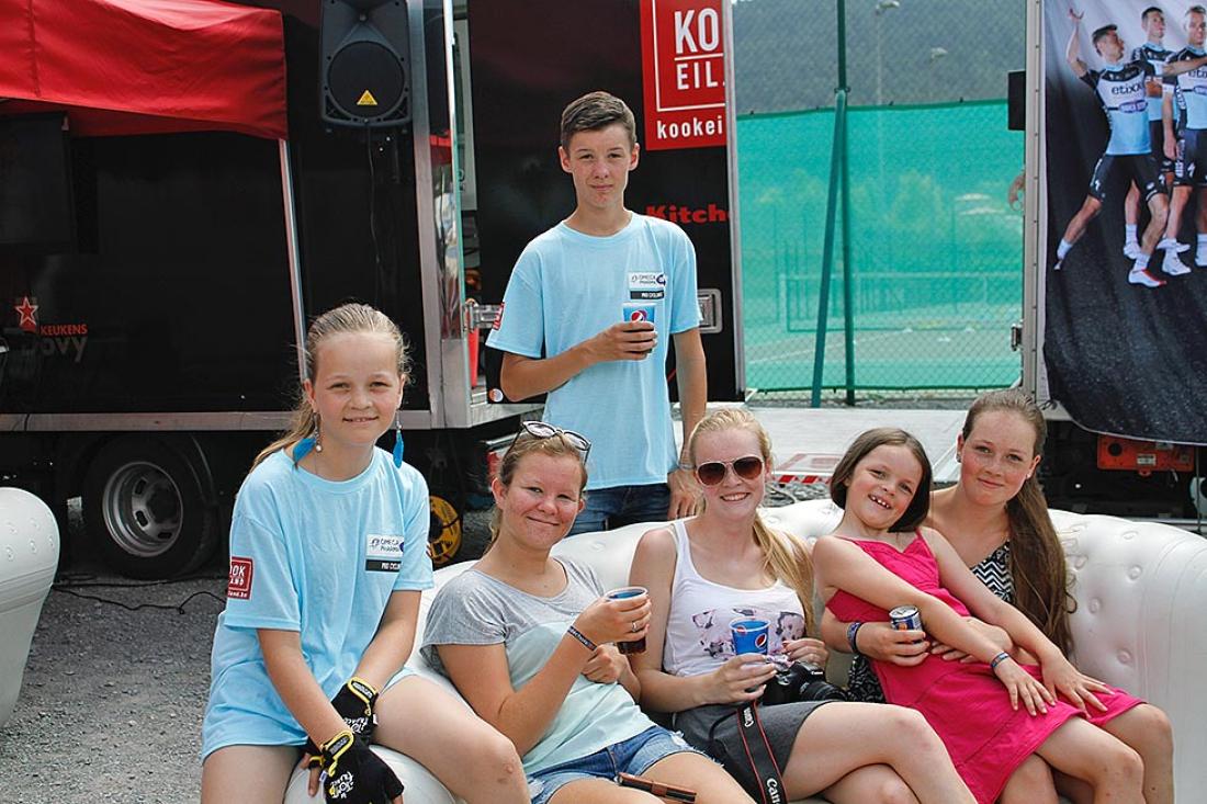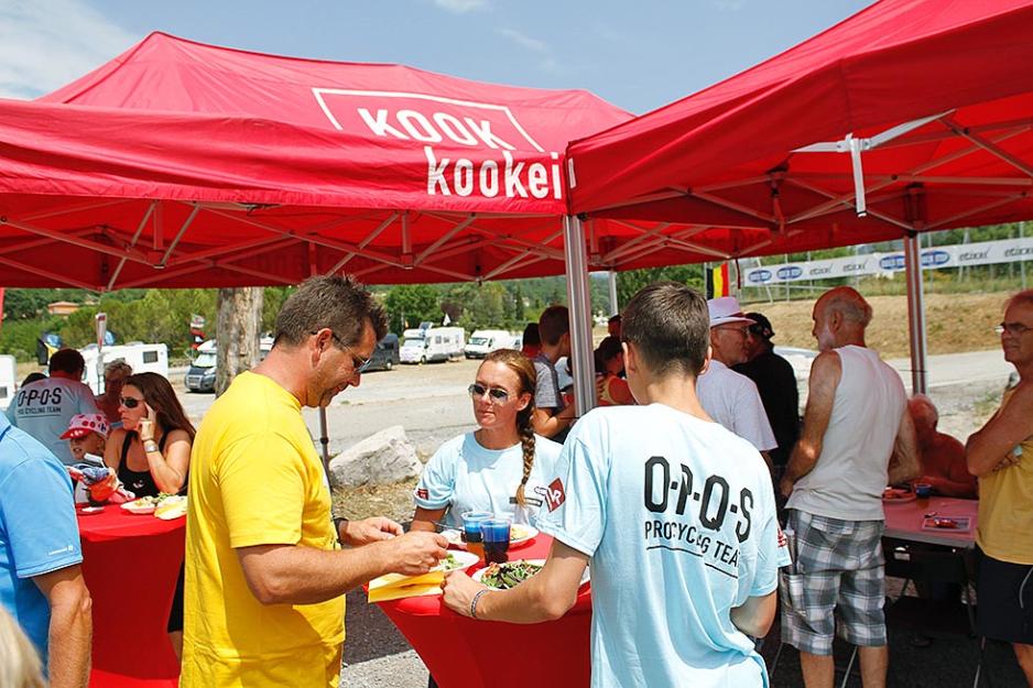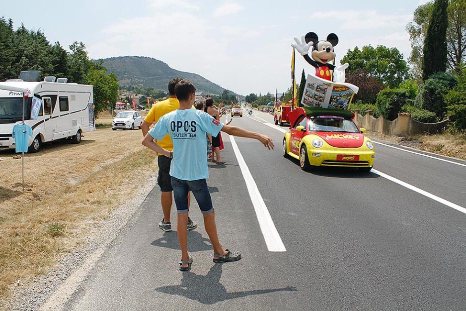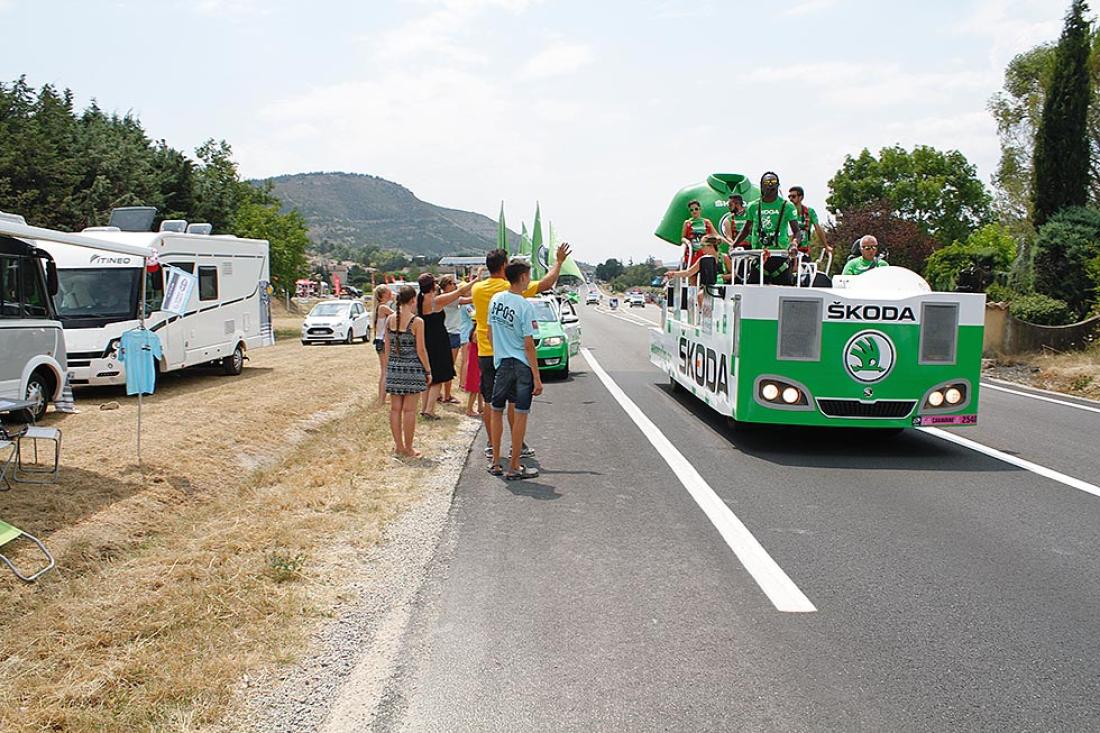 Før vi får tenkt på å lage lunsj blir vi invitert til full servering hos det belgiske teamet Quick-Step. For en hundrelapp får vi en treretters middag og drikke, mens vi slår oss ned i oppblåsbare sofaer eller ser på live-sending på storskjerm i skyggen. Det er gratis t-skjorter, buttons og capser overalt. Vi nyter virkelig livet, før alle får beskjed om at konvoien snart kommer. Her er det bare å stille seg opp langs veien, men det er kjempeviktig å holde avstand. Flere av kjøretøyene holder svært høy fart, og det er du som myk trafikant som må passe deg. Store mengder smaksprøver på fruktdrikke, pølser og kaker blir kastet til publikum fra noen merkelige kreasjoner av noen kjøretøy. Dette er høydepunktet for mange, og de fleste blir ivrige, og kaster seg over mer enn de trenger. Er du blant de er et godt tips å finne et sted hvor det er få andre, og veive med armer og rope hver gang en bil nærmer seg.