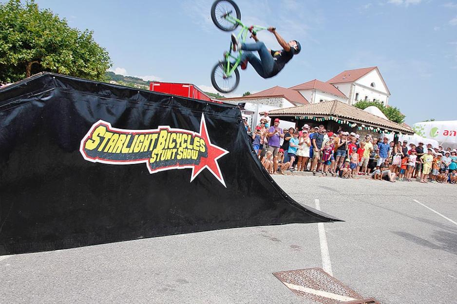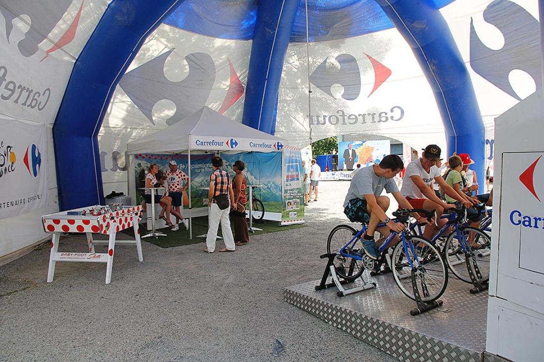 Noen hundre meter unna var det en liten landsby. Her hadde bygda stablet på beina alt de kunne mene var av interesse: Kanin-utstilling, sauer og kalver og flere salgsboder. Her kunne arrangøren også friste med alt fra gule ”ledertrøyer” til sykkelhansker for barn. På veien fant vi også sponsortelt med alt fra tegnerom til sykkelkonkurranser og gratis smaksprøver.