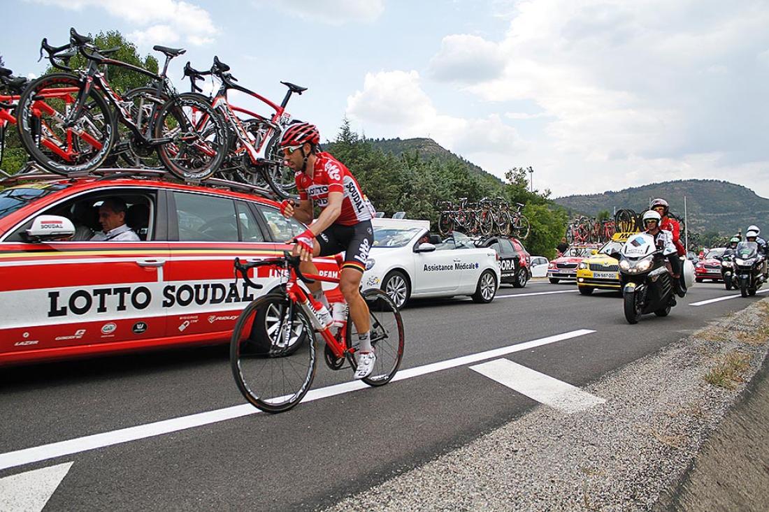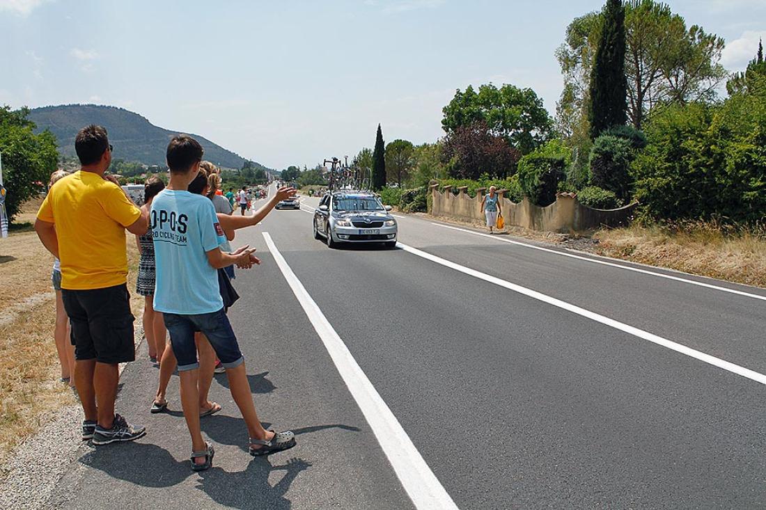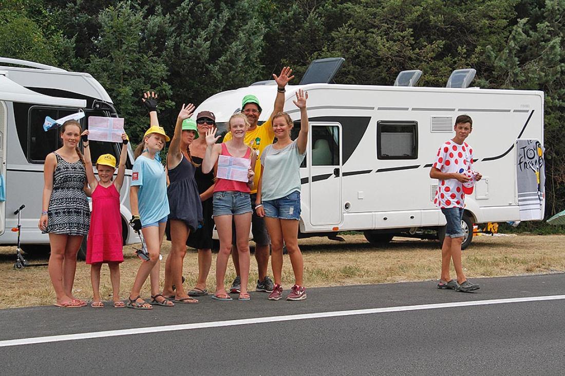 Vi rakk akkurat å spise dessert hos våre nye belgiske venner med Airstream mobilt kjøkken, før de første sykkelrytterne var i anmarsj. Og selv om det ikke er tilfelle, føltes det som om de sykler like fort som kolonnen kjører. I den svake motbakken vi stod i var farten imponerende høy, og for et utrent øye var de borte før du rakk å se hvem som var i klyngen. Men det er ingenting å si på stemningen, og det er rart å være så nærme noen du kun har sett på TV.