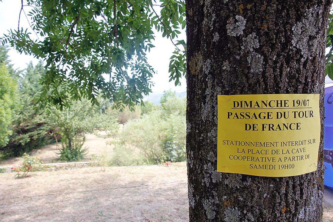 Men vi trosset advarselen og alle velmente råd, og svingte inn på veien som kun få timer senere skulle brukes til verdens mest berømte sykkelritt. Her var det pyntet til fest, og både unge og gamle var i ferd med å samles på fortau og torg. Det var ikke mange meterne mellom campingbordene.