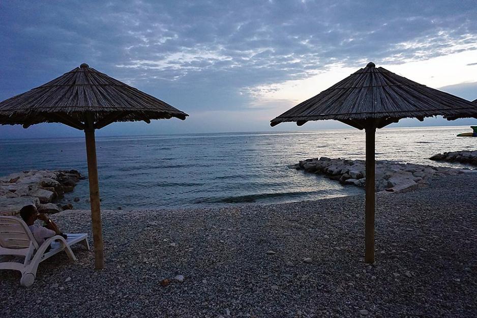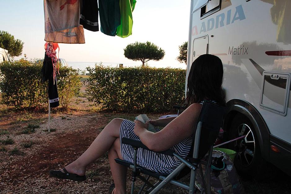 Vi er to ekvipasjer i følge, og vel etablert på plassene våre gleder barna seg over at det er kort vei til det innbydende Adriaterhavet. Våre plasser, som etter eget ønske er nærmest mulig havet, har ikke trær til beskyttelse for den hete sola. Noe av det beste med stedet, er at du kan få plasser som er godt tilbaketrukket og ligger skjermet mellom skyggefulle trær, eller så kan du som oss solsultne turister ønske deg så nærme havet som mulig.