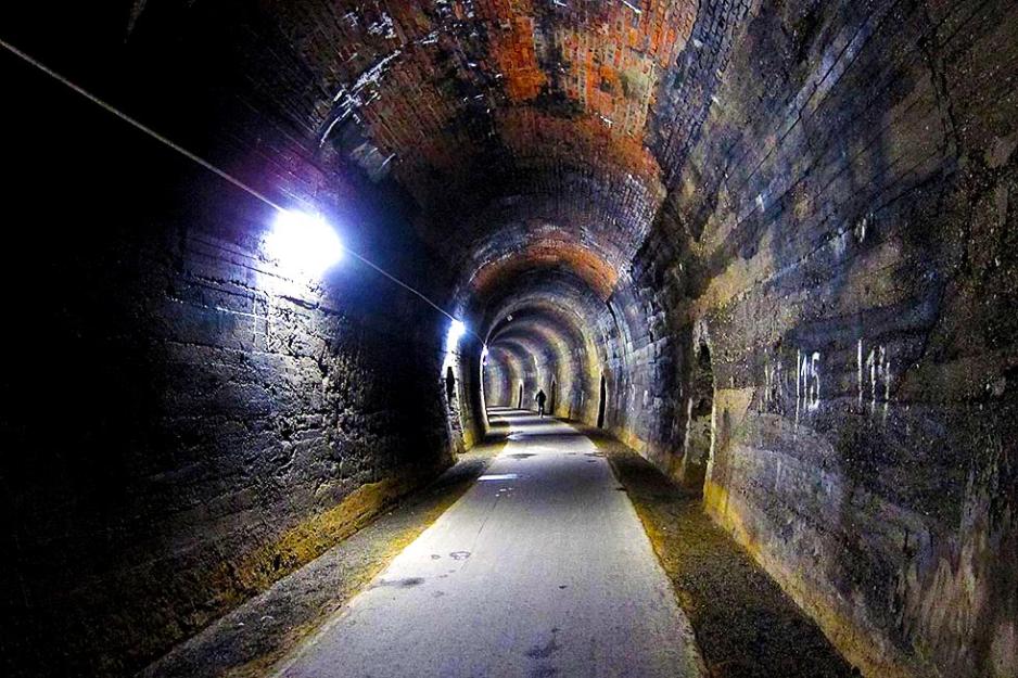På en slik tur er det greit å ha et godt og gammeldags kart på papir. Vi hadde før turen vanskeligheter med å skaffe et slikt over Belgia, men Nomaden i Oslo hadde Michelins kart i målestokk 1:350 000. I Tyskland bruker vi kartboken til ADAC i målestokk 1:150 000, men den er ikke videre hendig på sykkeltur. St. Vith ble grundig bombet under krigen, men er bygget opp til en koselig liten by. Den tilhørte i tidligere tider Tyskland, vi er jo i grenseområdet. Språket her er derfor tysk for de som behersker det. Bobilparkeringen ligger i utkanten av en større parkeringsplass. Plassen er litt skrå, men det går med et par plastkiler. I Pronsfeld er bobilparkering lagt på den gamle jernbanetomten som er helt flat. Herfra er det bare å legge ut på sykkeltur i ønsket trase. Vi dro nordover forbi Bleialf, der vi kunne passere gjennom en togtunell.