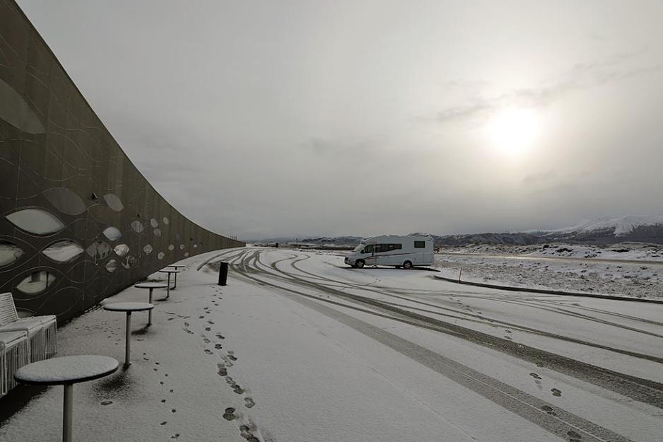 Mens jeg vurderer hva jeg skal finne på den kvelden, tar jeg en tur med hunden på svevestien. Den flotte gangstien rundt Eldhusøya nærmest klorer seg fast i fjellsiden, men stålkonstruksjonen føles trygg og er tilpasset rullestolbrukere og barnevogner, så jeg føler meg trygg. Utsikten denne dagen kan jeg ikke skryte av ettersom snøen igjen blåser vannrett. Når vi kommer tilbake, er vi godt fornøyd på frisk luft, og det blir en matbit i den lune og varme bobilen.
