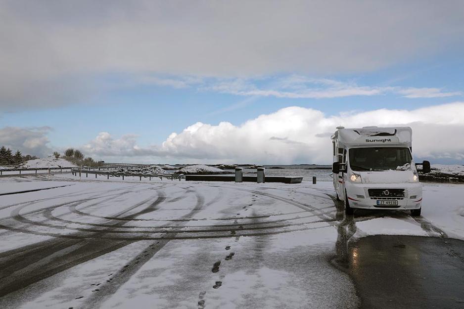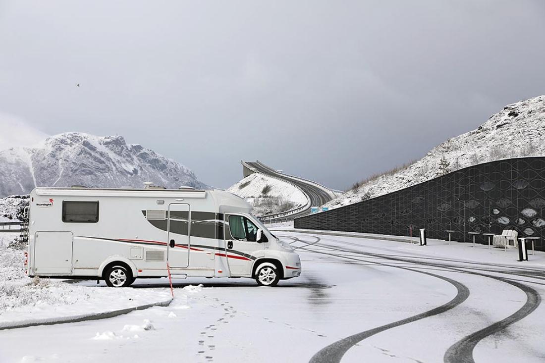 Jeg fikk et lite forvarsel da værmeldinga antydet en del regn de neste dagene. Likevel må jeg si jeg ble overrasket da jeg kjørte ned europavei 136 fra Dombås til Åndalsnes. Her var det ikke regn, her var det snø. Landskapet som møtte meg var hvitkledd. Og mer snø skulle det bli: Store hvite flak drev fløy vannrett i den økende vinden. Det røsket i bobilen hver gang den kom i åpent lende.
