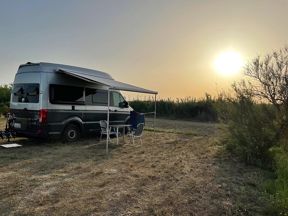 For jeg liker aller best å velge plass selv. Det meste av arealet til campingen er skyggefullt, takket være mange trær. Det er her de fleste har parkert, og jeg kan se at mange har rigget seg til for å bli her lenge. Vi kjører rett forbi. Vi skal bare bo her én natt og vil så nærme havet som mulig. Og det er bra med ledige plasser helt inntil stranden. Men, selv om vi kun er hundre meter unna, er det ikke mulig å se havet. Det er skjermet med et gjerde og en forhøyning i terrenget.