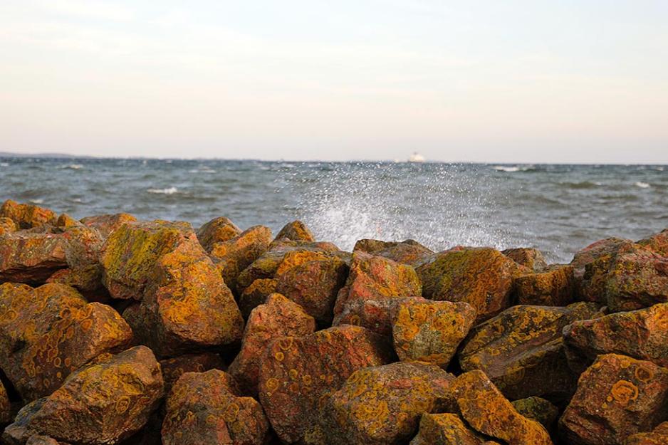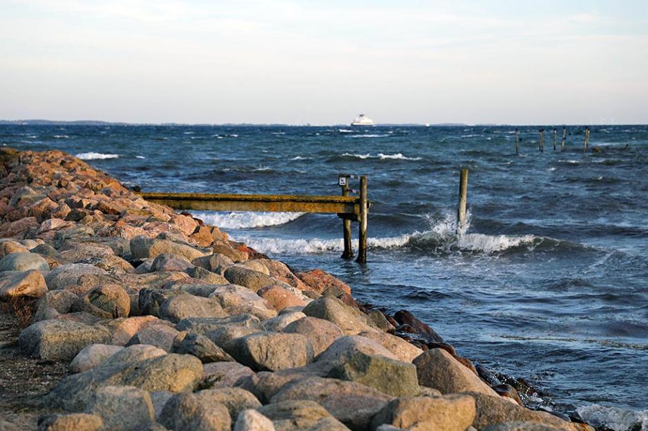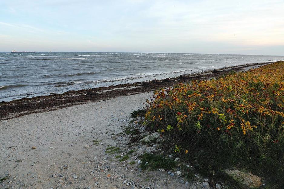 Med motvind og slak bakke fikk jeg brukt litt krefter. Men trøsten var at jeg jo ville få medvind hjem fra målet, som var Spodsbjerg Havn. Vel fremme ble det en tur ut på den store brygga, mens sjøsprøyten stod høyt takket være en frisk bris. Deilig med litt skikkelig vær. Litt lenger sør ligger stranden Drejet Strand, her var det bare noen kitere som trivdes på denne forblåste dagen. Kan se for meg det yrende livet her en deilig sommerdag.