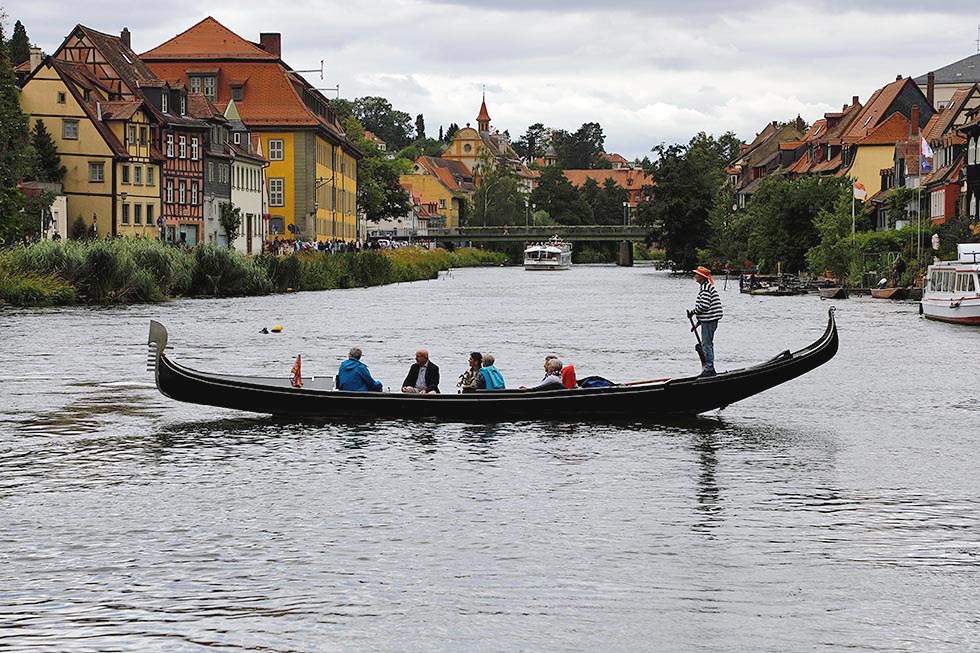 De 11 meter lange ekte venetianske gondolene føres langs Regnitz-elvens kanaler. Deler av elvebredden er smykket med pittoreske bindingsverkhus. Flere av de er så skjeve at det ser ut som om de kun holder seg oppe takket være nabohusene. Gondolene glir så sakte forbi det gamle rådhuset. Den imponerende bygningen er bygget på en liten kunstig øy midt i elven og tilgjengelig via flotte steinbroer. Bygningen er virkelig et spektakulært syn der den nærmest henger ut over elven. Legenden bak bygget er at biskopen av Bamberg ikke ville gi fra seg landområde til sine innbyggere så de kunne bygge seg et rådhus. Derfor ble utallige tømmerstokker brukt for å skape en kunstig øy i elven. Og her ble det bygget et rådhus i 1386.