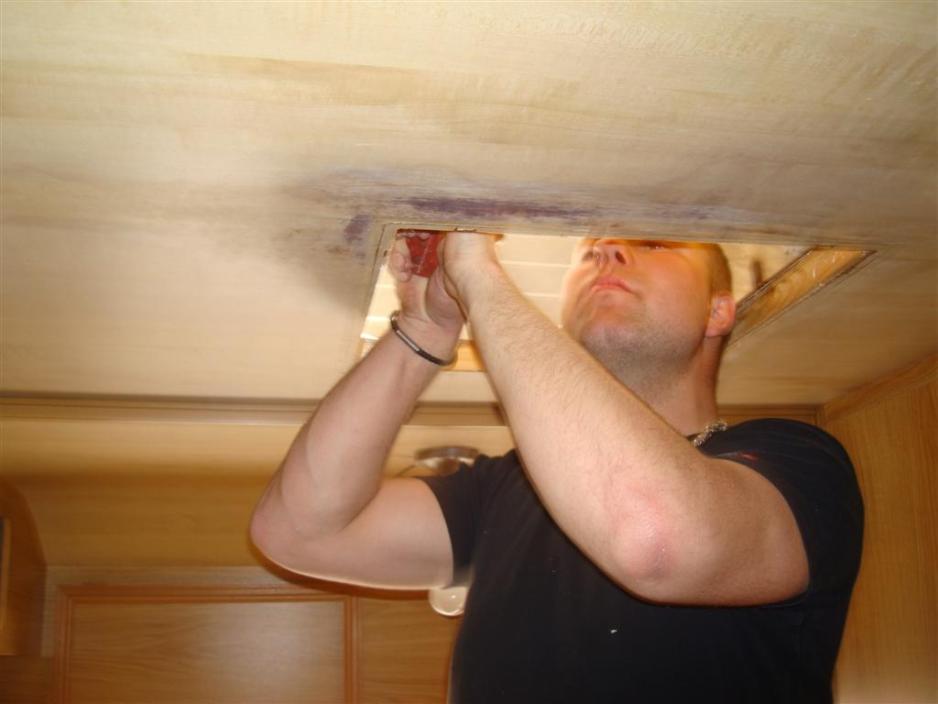 I taket var det også en skade, som hadde krevd et omfattende arbeid, men her har Jesper satt inn en ny takluke. Skaden er ganske enkelt skåret bort. Bonus med denne operasjonen er klar – en masse ekstra lys inn i campingvognen.