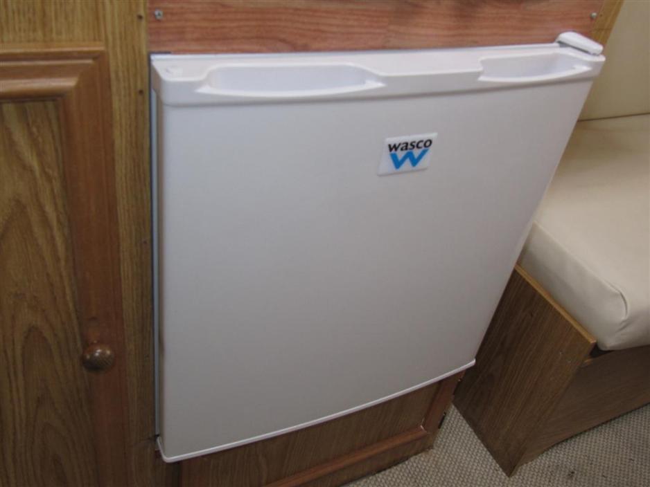 Et kjøleskap er det vanskelig å være foruten, så derfor har Rikke og Jesper satt inn et, som bare kan drives på 220 v og dermed bare brukes, når de er kommet fram til campingplassen og koblet på strøm. - Hvis vi handler og legger maten i kjøleskapet før vi reiser, må vi først og fremst sørge for at det er kaldt før vi skrur det av. Og så vil vi legge et par billige kjøleelementer inn i skapet mens vi forflytter oss, forteller Rikke.