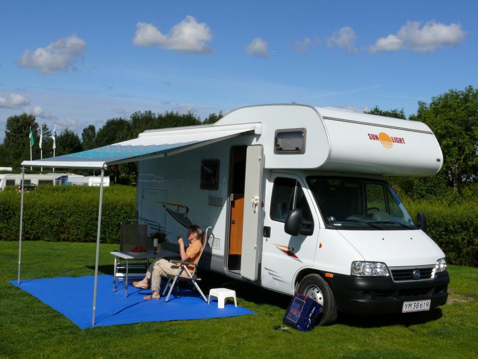 Er det ikke slett, kan det kompenseres med kiler, som bobilen kan kjøre opp på. Man kan alt etter forholdene sette kiler under alle fire hjulene. Det er lettest, hvis man er to personer, der den ene kjører, og den andre følger med utenfor bilen. Rull ned vinduene, slik at det er lettere å kommunisere. Nå kan markise eller fortelt settes på.