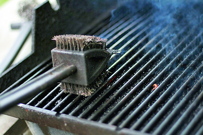 Ofte er det nok å bruke vanlig kjøkkenspray. Har du ekstra tøffe flekker kan du ty til ovnsrens. Spray godt over grillen, la såpen få virke noen minutter før du bruker en svamp eller klut med vann for å få av flekkene. Skyll godt av med lunkent vann og tørk over med en klut eller med papir. For å få ristene rene lønner det seg å investere i en skikkelig grillkost. Det finnes mange typer på markedet, alt etter hvor stor grill du har, størrelse på grillrillene og så videre. Man kan også bruke en vanlig kjøkkenskrubb om man ønsker det. Børst godt over. Løft av ristene og vask også godt nedi grillen. Bruk gjerne hageslangen for å spyle vekk alle såperester og smuss. Svi alltid av grillen før bruk. Bilpolish er faktisk veldig bra til å gi grillen en blank og fin overflate som er lett å holde ren. På grillben, etc. som er krommet så bruk en kromrens som for eksempel Duraglitt (bilpleieprodukt), bruk eventuelt stålull for å fjerne rust ogskitt og få den blanke overflaten tilbake.
