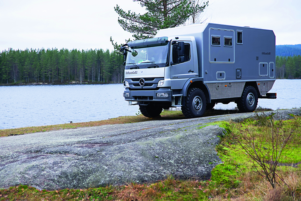 En slik bil er annerledes enn en vanlig bobil. Påbygget er en selvstendig enhet, fleksibelt montert på chassiset med seks elastiske lager. En slik terrengbil vrir seg under kjøring, og påbygget tåler ikke det over tid. Derfor er det også laget en fleksibel sluse, med luke mellom påbygg og førerhus. Bodelen er godt isolert, med over 50 mm tykke vegger og tak. Innvendige mål er 472 x 231 x h 196 cm. Det gir god plass til sittegruppe for fire, kjøkkenbenk, toalettrom med separat dusj, skapseksjon og dobbeltseng bak. Denne måler 210 x 145 cm og er bra dimensjonert. Videre har bilen en nyttelast på over 3,3 tonn. Utvendig er målene 696 x 243 x h 348 cm. – Tross bredden er bilen lett manøvrerbar i bymiljø, forteller Axel. Motoren er noe for seg. Sekssylindret på 7,7 liter med 238 hk og et dreiemoment på 1000 Nm. Det siste er kjekt å ha i ørkensand, der rullemotstanden kan være enorm. Videre er bilen forberedt for kulde ned til minus 30 grader, og i varmt vær er det klimaanlegg både i førerhus og i bodel. Batterikapasiteten er 4 x 110 Ah. Som sagt er utstyrslisten lang, du klarer deg i de fleste situasjoner.