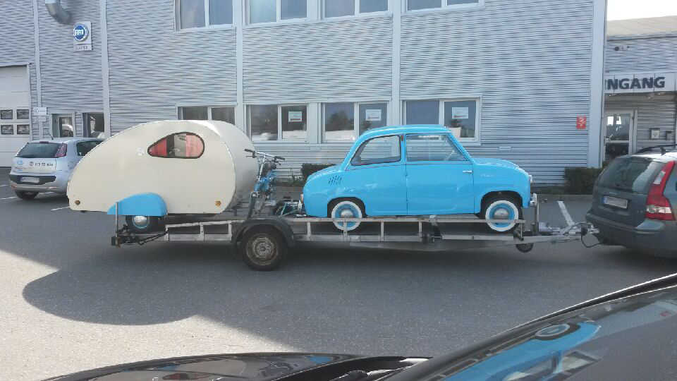 Men en av våre lesere av vår søsterpublikasjon Bobil og Caravan, fanget denne matchende bilen og campingvognen hos en forhandler i Grimstad. Legg merke til sykkelen på draget. Utrolig stilig!
