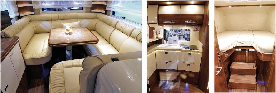 Den tyske luksusprodusenten Concorde har lenge hatt modeller med rundsittere, og det finnes flere virkelig lekre løsninger med en helt spesiell nærhet mellom sofa og kjøkken. Det gjelder også den nye løsningen på Carver 791 RL, hvor den ene enden på u-sofaen møtes av den langsgående kjøkkenbenken. Treverk og fargevalg er forholdsvis konservativt i sitteområdet, mens kjøkkenet i helhvitt ser friskt og moderne ut. I front er det senkeseng med langsgående senger og godt med plass. I midtpartiet er det baderom og dusj, med omkledningsmuligheter og skapplass. 791 RL er en attraktiv luksusmodell for to personer.