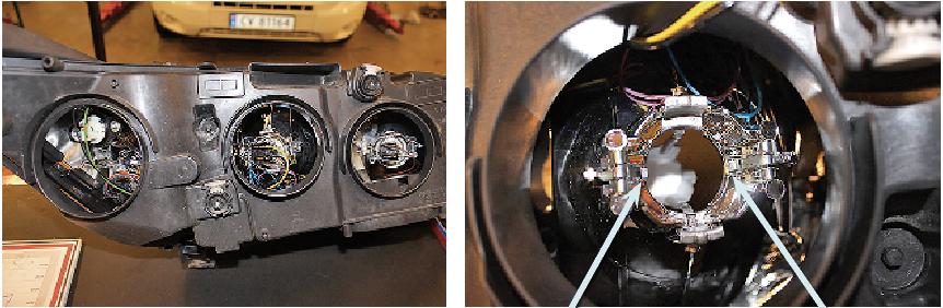 Disse pærene sitter ikke festet med en ståltrådbøyle slik vi er vant til. Pærens mansjett trykkes inn mellom to klemmer som holder pæren. Motsatt er det bare å trekke pæren ut. Dette gjelder bare hovedlyset - de andre pærene vris og trekkes ut. Vær nøye med å få pæren i riktig posisjon.