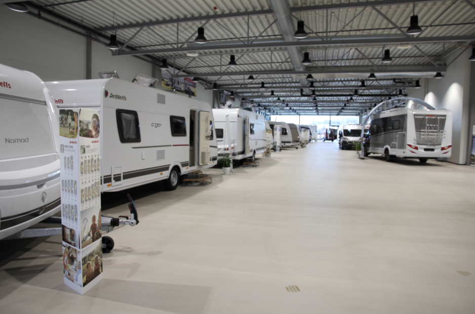 Det nye caravansenteret har et stort kundegrunnlag med hele 14 campingplasser innenfor en radius på 30 minutters kjøring. På den store parkeringsplassen er det etablert gratis bobilplasser med tømmemuligheter, og innendørs i de store utstillingshallene over to plan har softis-maskinen allerede rukket å bli et trekkplaster.